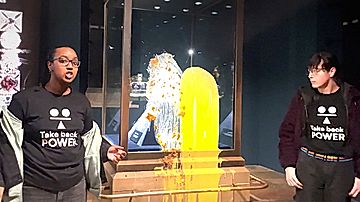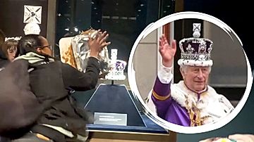 英ロンドン塔で王冠の展示ケースに市民団体メンバーが食品を投げつける