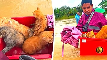 大洪水の中、飼い猫たちみんなと一緒に避難した男性――タイ