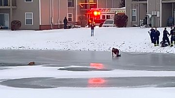 Bomberos de Indiana rescatan a un perro que cayó en un estanque helado