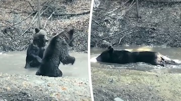 Niedźwiedź grizzly poluje na ofiarę – wilki kontratakują