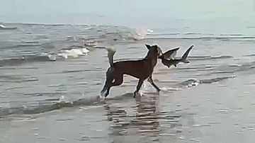 Dingo affamato ruba uno squalo catturato per sbaglio da un pescatore