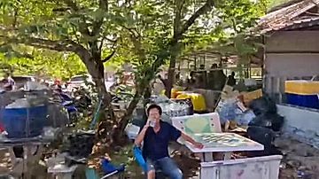 Un hombre en Tailandia rescata a sus gatos de una inundación improvisando un bote pequeño plástico